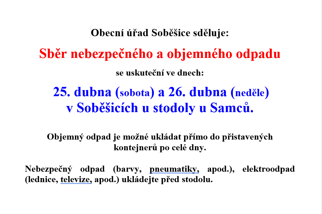 Dne 25 - 26.4.2026 se bude konat sběr nebezpečného a objemného odpadu.